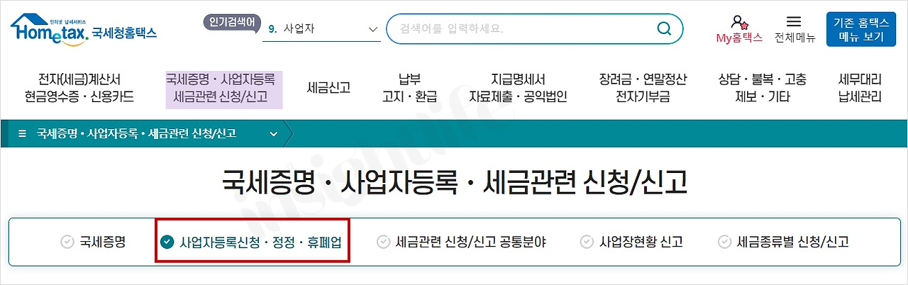 사업자등록 신청: 홈페이지 상단 메뉴에서 ‘국세증명·사업자등록·세금관련 신청/신고’를 클릭한 다음, ‘사업자등록신청 정정 휴폐업’ 메뉴를 선택합니다.