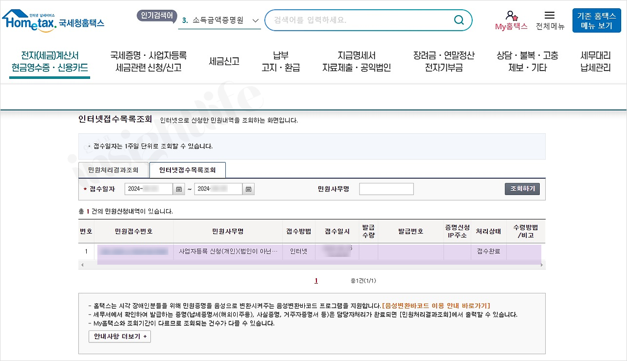 인터넷접수목록조회에서 접수완료 된 것을 확인하실수 있습니다. 저같은 경우는 밤 11시에 신청했는데 다음날 오전9시반 경에 바로 처리 완료되었습니다. 온라인으로 할 경우 이슈가 없으면 이렇게 빨리 처리 될수 있습니다.