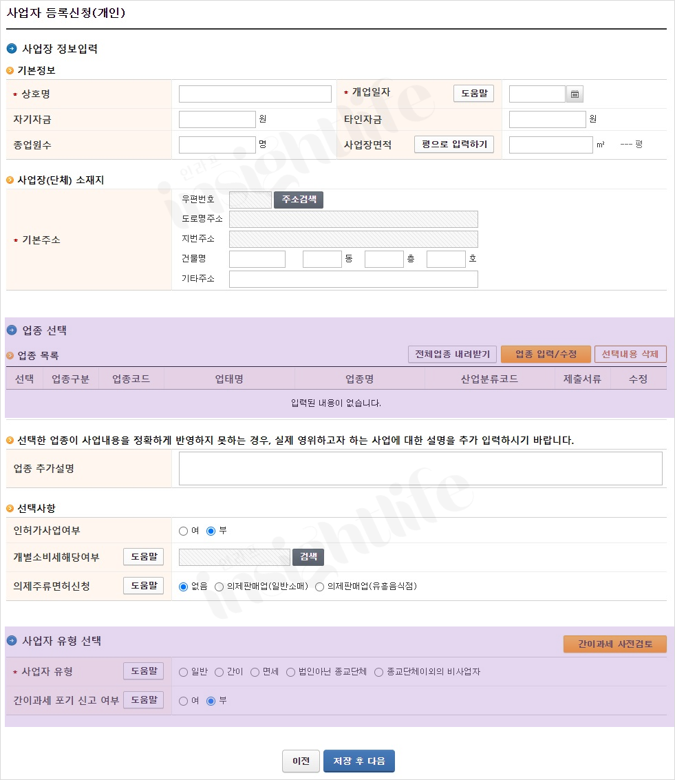업종 선택: 사업과 관련된 업종을 선택합니다. 업종 입력/수정을 클릭하여 본인이 하려는 사업고 가장 유사한 업종을 선택하면됩니다. 선택한 업종에 따라 사업자의 유형이 달라질 수 있습니다(일반과세자, 간이과세자 등).