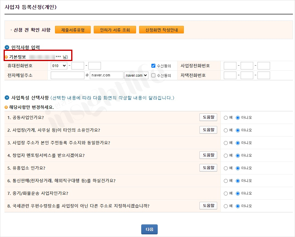 인적사항 입력 : 본인의 인적사항, 사업장 정보 등의 내용을 입력합니다.