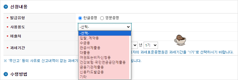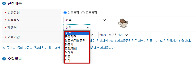 신청 양식을 작성합니다. 로그인 정보에 따라 사업자등록번호는 자동으로 선택됩니다. 발급유형, 사용용도, 제출처, 과세기간을 입력합니다. 과세기간은 분기별로 선택할 수 있으며 요구처에서 요청한 기간을 기준으로 설정합니다.