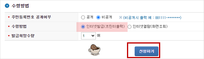수령 방법을 선택합니다. 인터넷 발급(프린터 출력)을 선택하고, 발급 희망 수량을 기입한 후 '신청하기' 버튼을 클릭합니다.