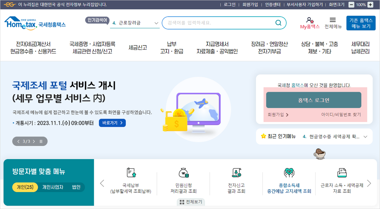 먼저 홈택스에 접속합니다. 회원가입이 되어있지 않다면, 회원가입을 먼저 진행해야 합니다. 로그인은 공동 인증서나 간편 인증을 통해 할 수 있습니다.