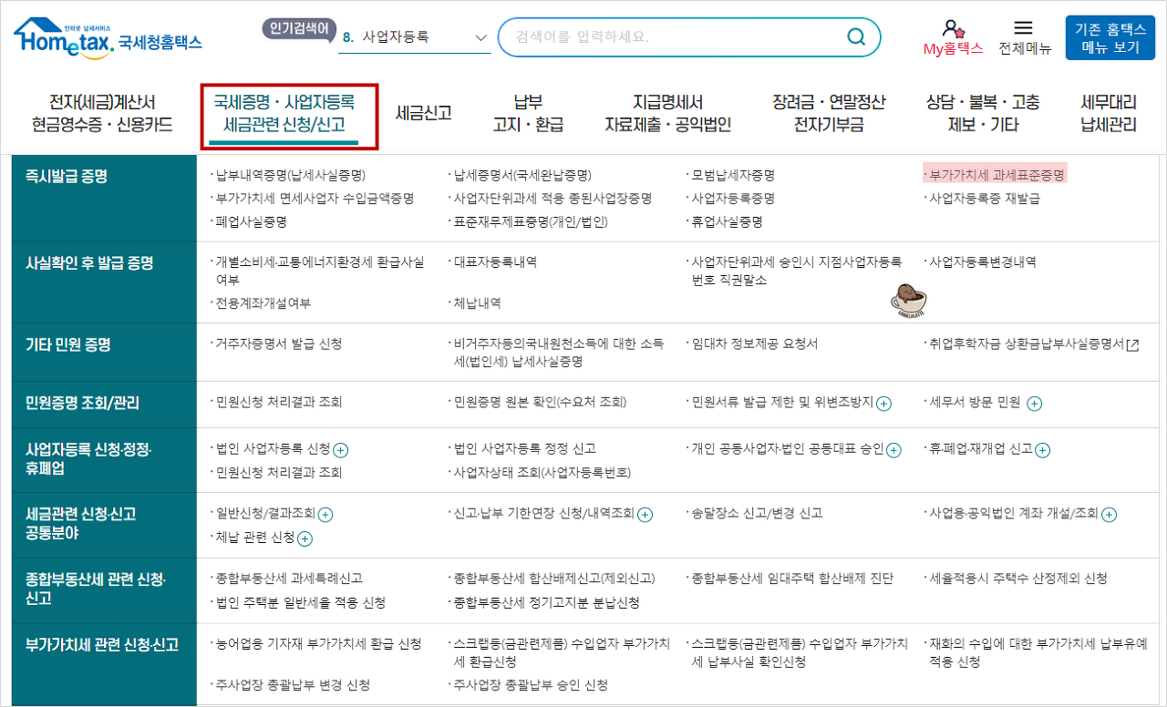 부가세과세표준증명원 인터넷 발급 - 홈택스