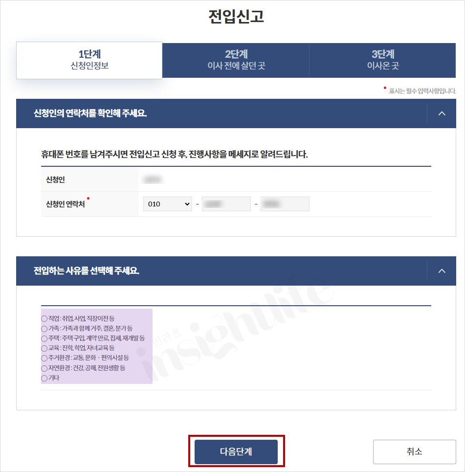 신청인 정보 입력 및 전입사유 선택: 신청인 정보는 로그인을 했기 때문에 자동으로 입력이 됩니다. 적절한 전입 사유를 선택하고 다음단계를 클릭합니다.