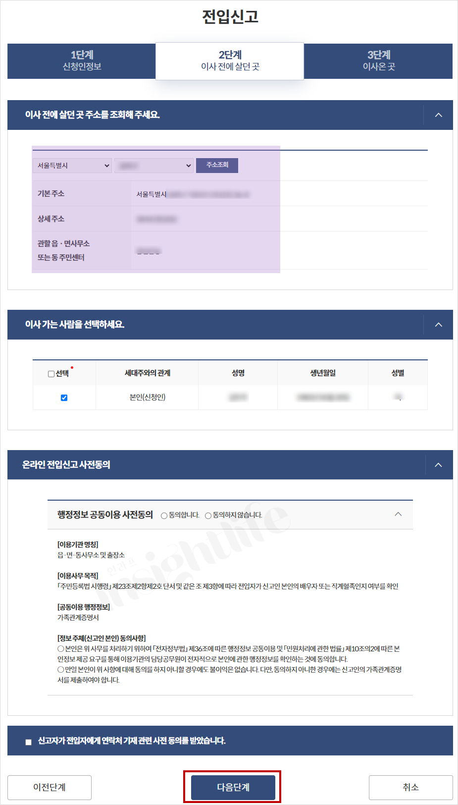 이전 주소 기입 및 이사가는 사람 선택: 이전 주소를 입력하고 이사가는 사람을 선택합니다. 저는 1인 세대 구성이라 제 이름만 뜨고 있어요. 온라인 전입신고 사전 동의에 체크한 후 다음단계를 클릭합니다.