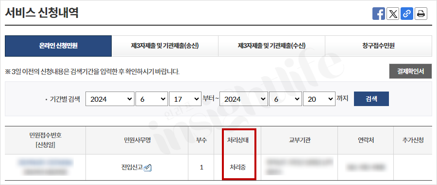 서비스 신청내역에서 처리 상태를 확인할 수 있으며, 처리가 완료되면 문자로 회신받을수있고 처리상태가 처리완료로 바뀌어서 보입니다.