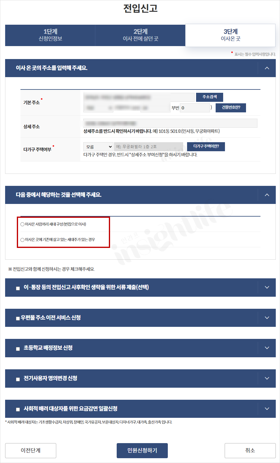 새 주소 및 세대 구성 입력: 이사온 곳의 주소와 세대 구성을 선택합니다.