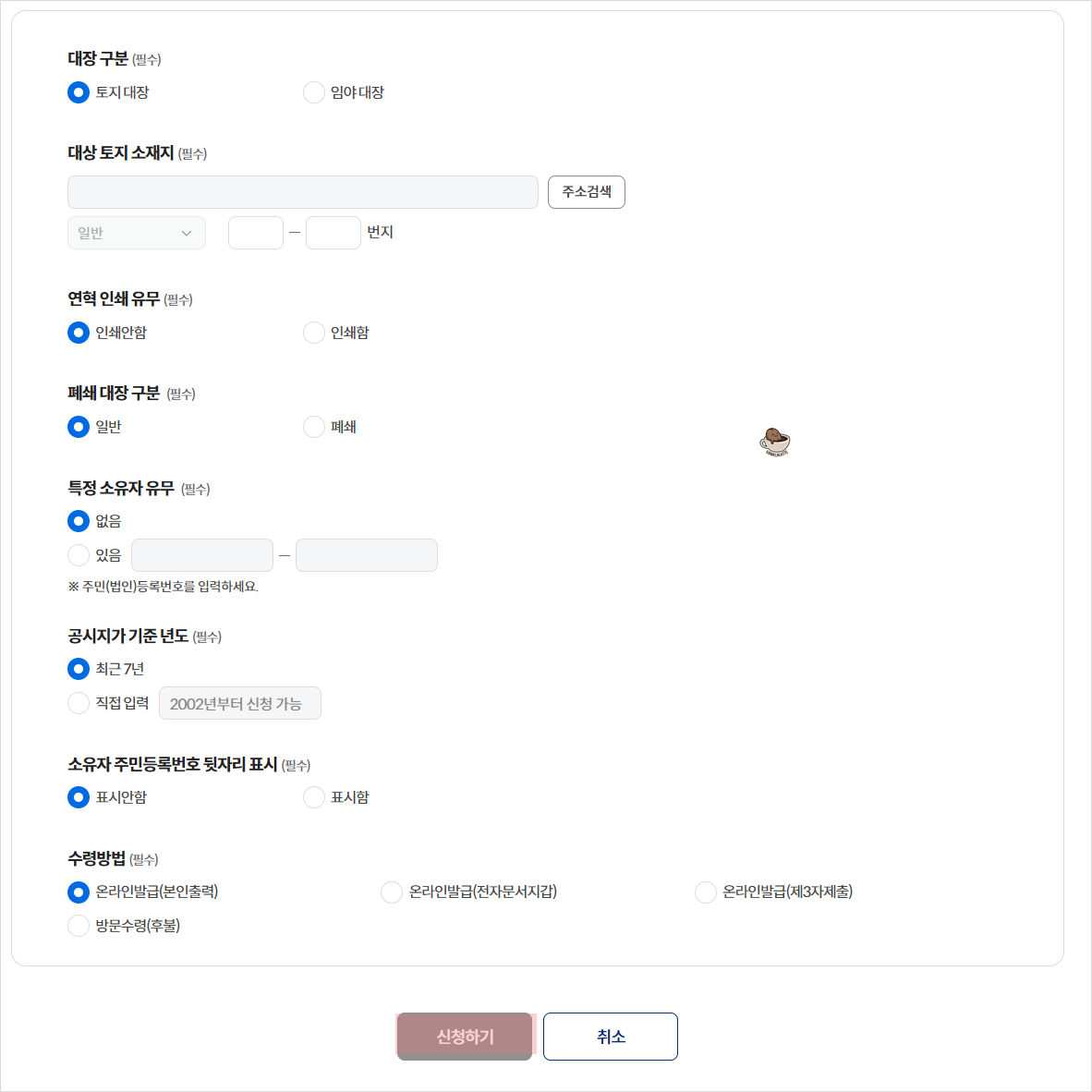 대상 토지 소재지, 연혁인쇄유무 등 필수사항을 표기한 후 신청하기를 클릭해주세요.