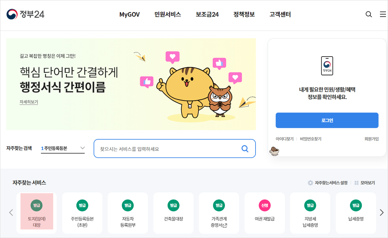 메인화면에서 중간에 자주찾는서비스에서 바로 확인하실 수 있습니다. 안보이면 검색창에서 토지대장을 검색하셔도 됩니다.