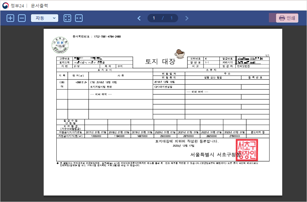 문서출력을 클릭하면 토지대장이 조회되며 인쇄를 클릭하여 출력이나 PDF 저장을 할 수 있습니다.