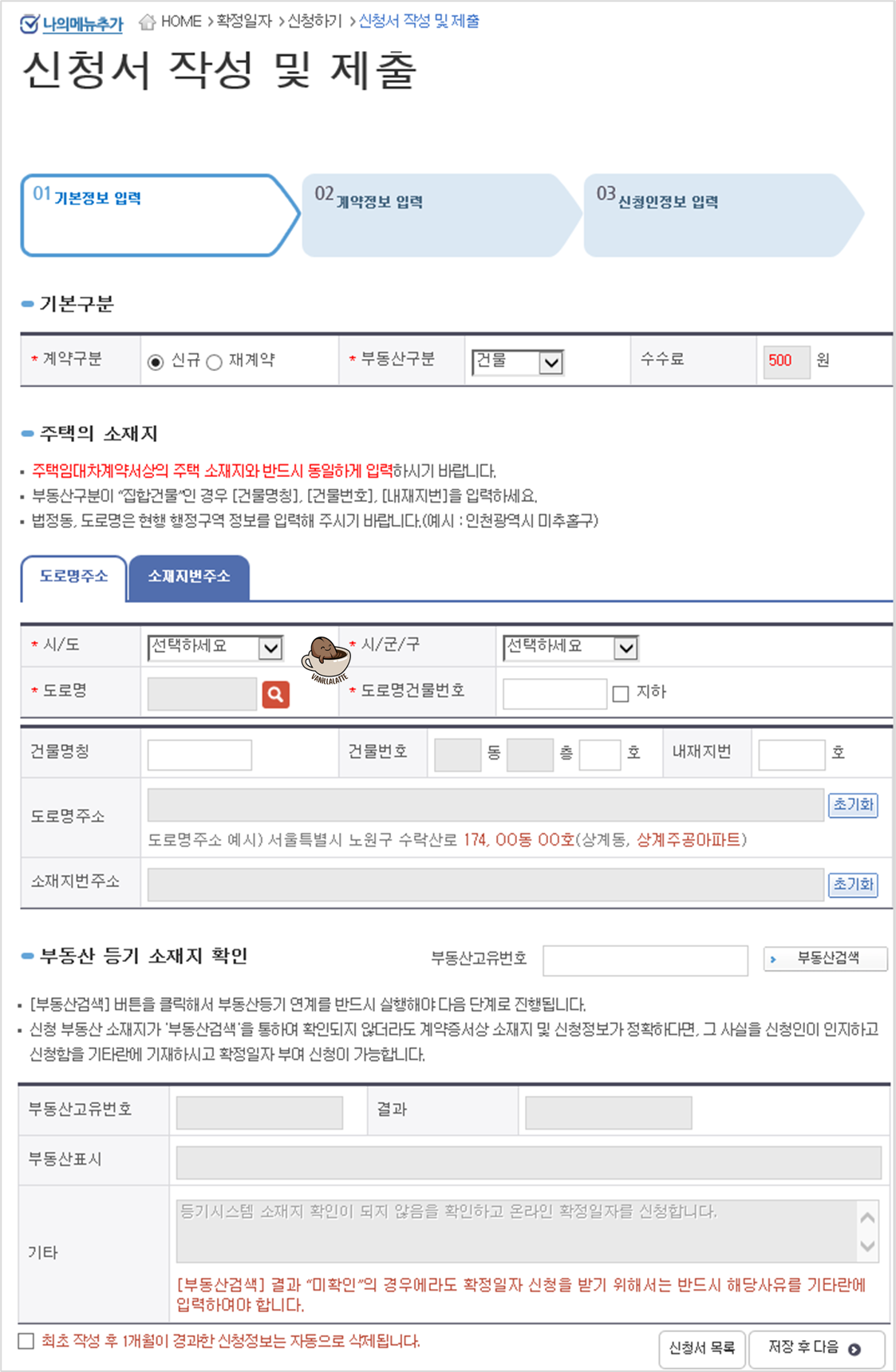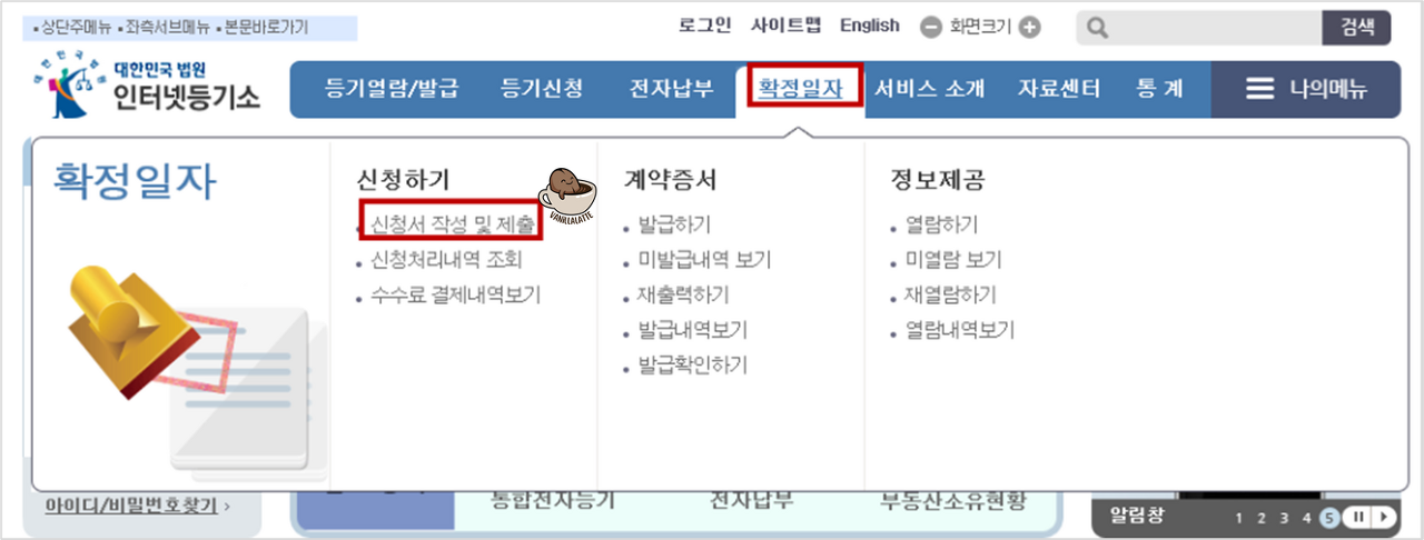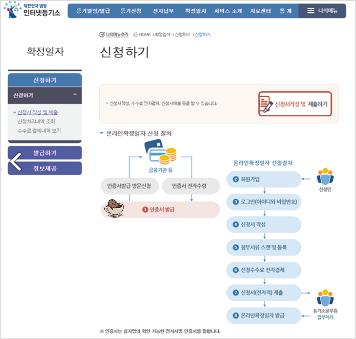 인터넷등기소 로그인 > 확정일자 > 신청하기 > 신청서 작성 및 제출